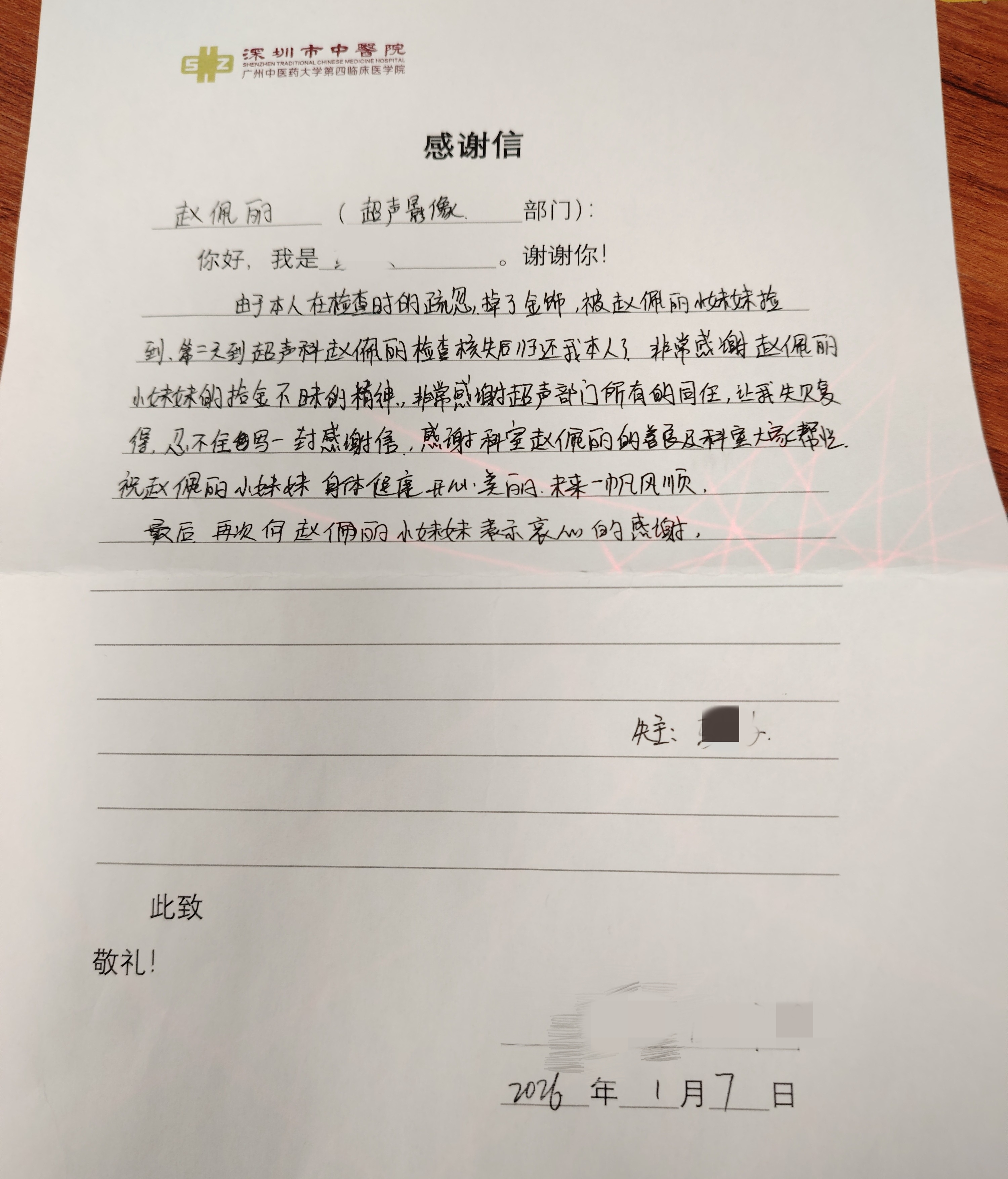 次日,一位女士焦急地来到超声影像科前台询问,得知工作人员捡到了她遗失的物品后,顿时喜出望外。她说,这枚貔貅吊坠是她与丈夫的结婚纪念物,对她意义非凡。女士激动地连声道谢,表示要赠送锦旗以表感谢。但赵佩丽和同事们表示,能够物归原主便是最大的欣慰,不必破费。失主感动之余,特意送来一份亲笔撰写的感谢信,字里行间满是真挚的感激之情。超声影像科团队表示将把这份善意传递下去,继续践行医者仁心的优良传统。