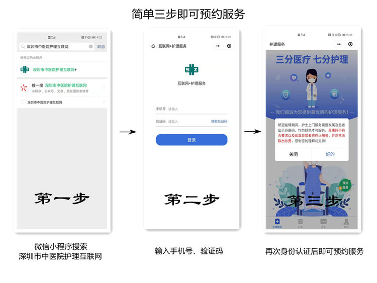 已在深圳市中医院住院病区收案的患者,可通过微信搜索“深圳市中医院护理互联网+”小程序,注册登记并认证后便可按自身需求在小程序上直接下单了。