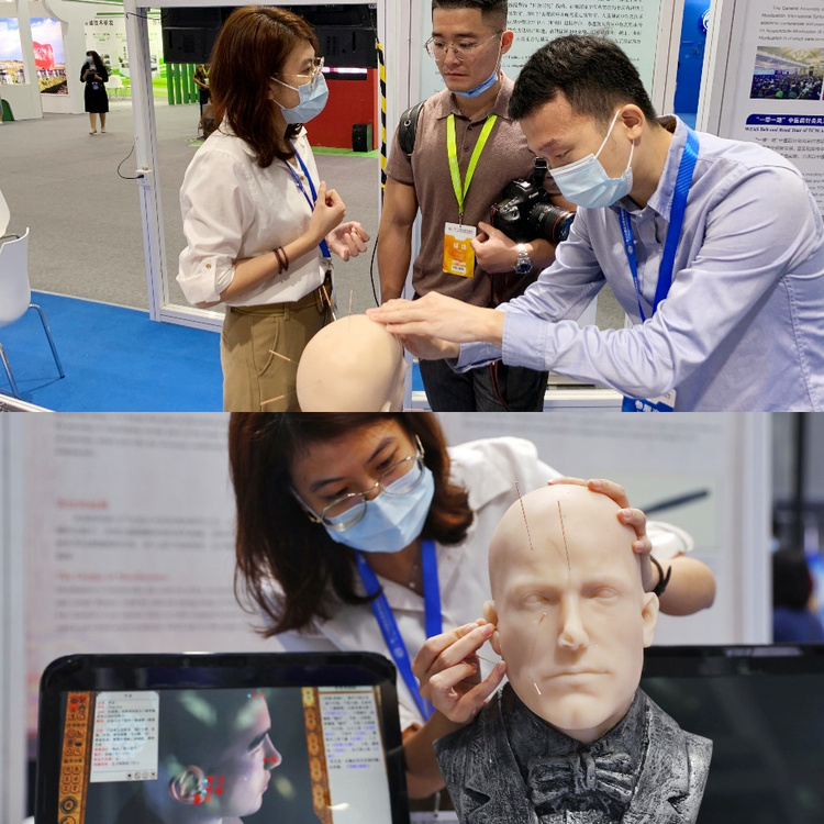 “智能仿真针灸系统”由深圳市中医院、深圳市先进技术研究院及三名工程团队共同研发,运用虚拟/增强现实、人机交互、智能传感和先进材料等技术,使用硅胶制作高还原度、内置穴位传感器的仿生人,并将其与数字虚拟人体同步链接,从而实现经穴标注、腧穴解剖、经络循行、针灸实践操作、针灸治疗等多种功能。学员在对仿生人进行针灸操作时,能够在数字人体上实时观测到针刺路径,并能快速掌握危险穴位的三维毗邻解剖结构,从而达到更加直观立体的针刺联系体验,使针灸教学摆脱了仅能以人体为对象的限制,学员可以通过仪器进行模拟练习,安全且高效,极大地提升了针灸教学的质量及学员临床实践操作的能力。