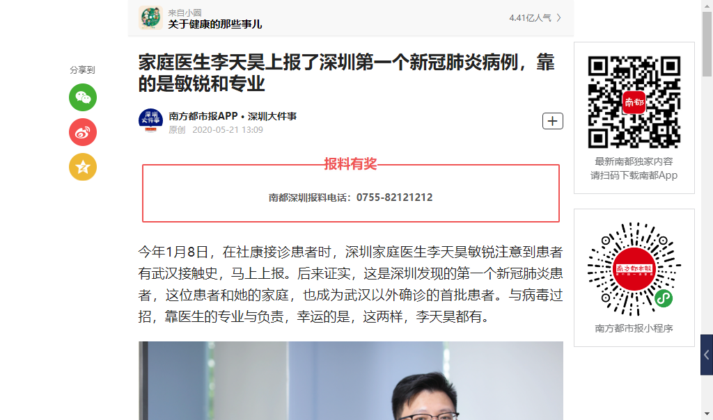 今年1月8日,在社康接诊患者时,深圳家庭医生李天昊敏锐注意到患者有武汉接触史,马上上报。后来证实,这是深圳发现的第一个新冠肺炎患者,这位患者和她的家庭,也成为武汉以外确诊的首批患者。与病毒过招,靠医生的专业与负责,幸运的是,这两样,李天昊都有。