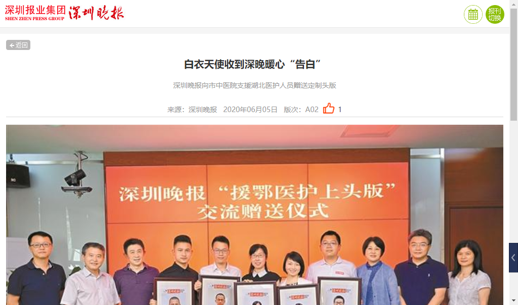 据了解,5月12日护士节当天,为表达对援鄂医护人员的敬意,深圳晚报推出了“援鄂医护上头版”的特别策划。当天,深圳援鄂医疗队的所有护士都登上深圳晚报头版,深圳晚报同时为所有援鄂医护人员都制作了定制头版相框,赠送给每一位援鄂医护人员。接下来,深圳晚报还将陆续走进深圳其他医院,将定制头版相框和由衷敬意送到援鄂医护人员的手中。