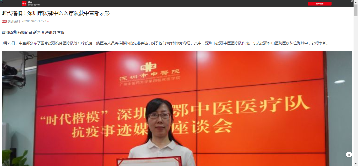 9月23日,中宣部公布了国家援鄂抗疫医疗队等10个抗疫一线医务人员英雄群体的先进事迹,授予他们“时代楷模”称号。其中,深圳市援鄂中医医疗队作为广东支援雷神山医院医疗队位列其中,获得表彰。