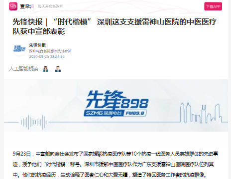 9月23日,中宣部向全社会发布了国家援鄂抗疫医疗队等10个抗疫一线医务人员英雄群体的先进事迹,授予他们“时代楷模”称号。深圳市援鄂中医医疗队作为广东支援雷神山医院医疗队位列其中。他们的抗疫经历,生动诠释了医者仁心和大爱无疆,塑造了特区医务工作者的抗疫群像。