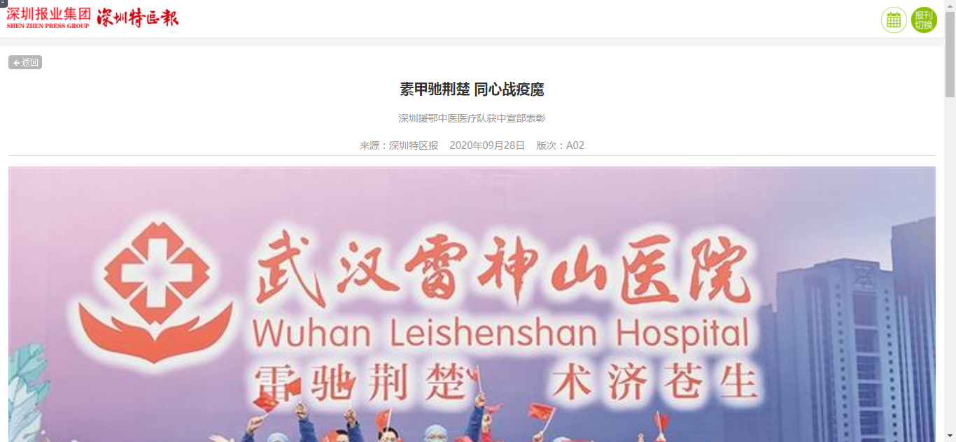 悬壶素甲驰荆楚,术济苍生战疫魔!从2020年2月17日星夜抵达武汉,到3月28日病区清零,3月31日返回深圳,深圳中医医疗队的25名队员在武汉雷神山医院整整战疫44天。一共救治了46名患者,辨证施治效果显著,仅用40天就实现了病区患者清零,没有一例轻症向重症转化病例,也实现了“零死亡”。深圳中医用大无畏精神和精湛医术,树起大医精诚的中医药文化旗帜,谱写了一曲携手战疫的爱之赞歌。