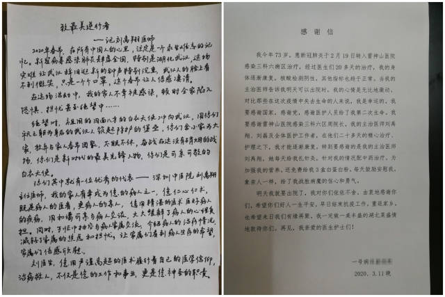病区一位77岁老人,入院时已告病重七日,米水未进,自觉时日无多,准备自我放弃。在儿子的要求下,这位老人转院至雷神山医院深圳医疗队所负责的病区。入院时,老人气憋,血氧低,凝血功能异常。医生给他应用无创呼吸机辅助通气,中药温阳益气,宣肺化痰,加上营养支持。在医务人员的精心照料下,老人的病情日渐好转,脱离了呼吸机,开始能自己进食,并能下地活动,气促的症状一天天好转,不太擅用手机的他,用了近二个小时在“雷神山C6医患群”中敲出二百多字不带标点符号的感谢信,表达内心的感谢。住院21天,老爷子康复出院了。