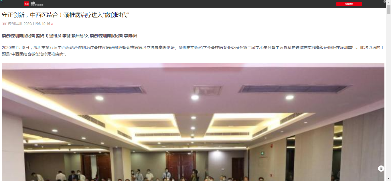 2020年11月8日,深圳市第八届中西医结合微创治疗脊柱疾病研修班暨颈椎病病治疗进展高峰论坛、深圳市中医药学会脊柱病专业委员会第二届学术年会暨中医骨科护理临床实践高级研修班在深圳举行。此次论坛的主题是“中西医结合微创治疗颈椎疾病”。