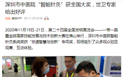 2020年11月19日-21日,第二十四届全国发明展览会——一带一路暨金砖国家技能发展与技术创新大赛在佛山举行,深圳市中医院智能针灸系统荣获“非遗智慧与创新”专项奖,现场吸引了众多观众驻足观摩、互动体验。
