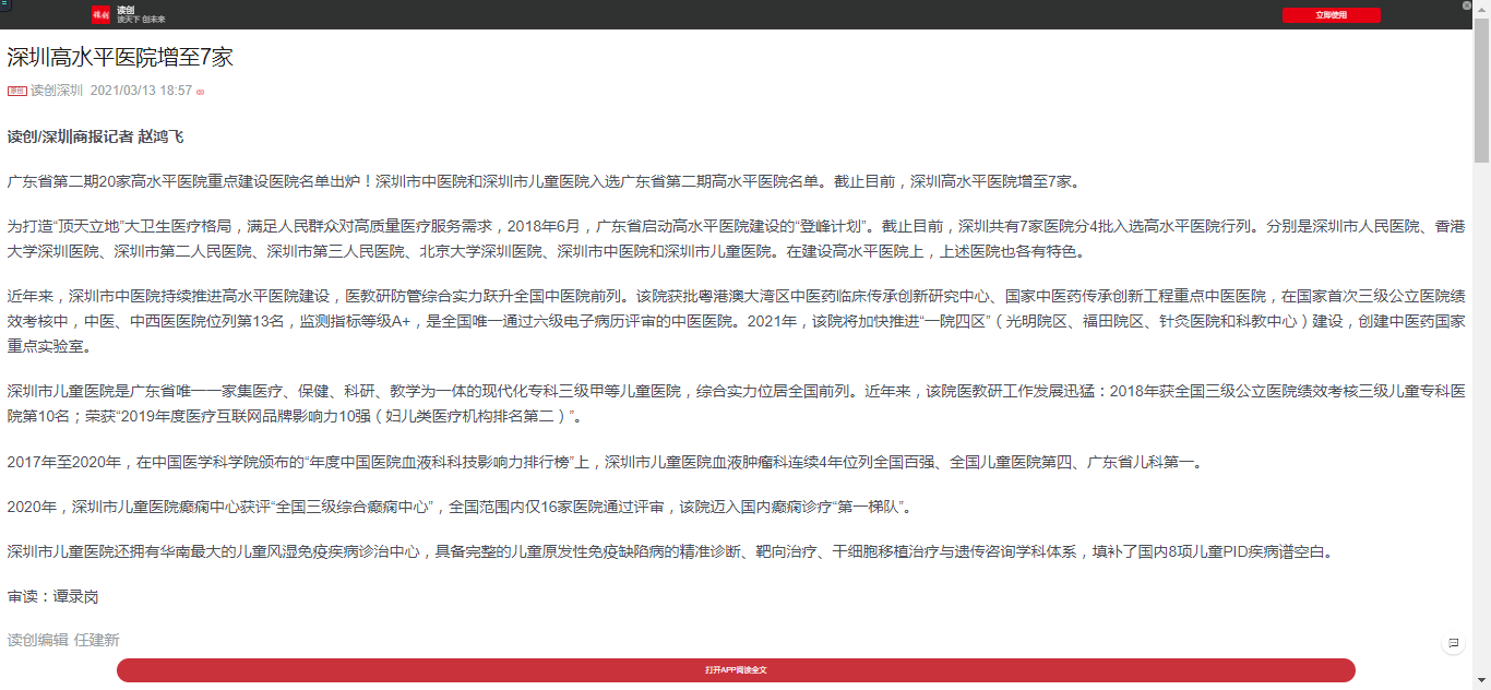 为打造“顶天立地”大卫生医疗格局,满足人民群众对高质量医疗服务需求,2018年6月,广东省启动高水平医院建设的“登峰计划”。截止目前,深圳共有7家医院分4批入选高水平医院行列。分别是深圳市人民医院、香港大学深圳医院、深圳市第二人民医院、深圳市第三人民医院、北京大学深圳医院、深圳市中医院和深圳市儿童医院。在建设高水平医院上,上述医院也各有特色。
