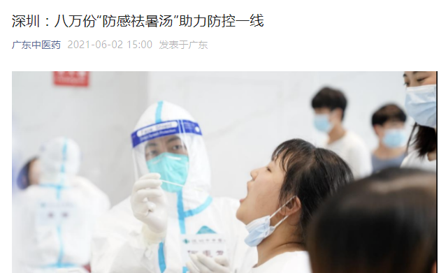 据深圳市中医院呼吸与危重症医学科主任陈生介绍,“防感祛暑汤”具有健脾益气,扶正解表、祛暑化湿的功效,是根据中医“治未病”理论,结合深圳当季的气候特点,特为奋战在抗击疫情一线的医护人员制定的,有益调整人体“内环境”,增强抗病能力,降低感染风险。截至6月1日,深圳市中医院已累计向全市各核酸采集队发放“防感祛暑汤”逾8万份。