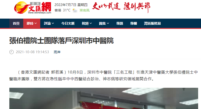10月8日,深圳市中醫院「三名工程」引進天津中醫藥大學張伯禮院士中醫臨床團隊,雙方將在急性腦卒中中西醫結合診治、神志病等研究領域展開合作。