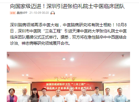 深圳脑病领域再添中医大咖,中医脑病研究将有院士相助!10月8日,深圳市中医院“三名工程”引进天津中医药大学张伯礼院士中医临床团队揭牌仪式正式举行。据悉,双方将在急性脑卒中中西医结合诊治、神志病等研究领域展开合作。