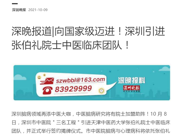 深圳脑病领域再添中医大咖,中医脑病研究将有院士加盟助阵!10 月 8 日,深圳市中医院 " 三名工程 " 引进天津中医药大学张伯礼院士中医临床团队,并正式举行签约揭牌仪式。市中医院脑病与心理病科将依托张伯礼院士全国名中医工作室和天津中医药大学循证医学中心,进一步提升脑病及焦虑抑郁的临床诊治和科研工作,特别是脑血管病譬如脑卒中、血管性认知障碍等方面。