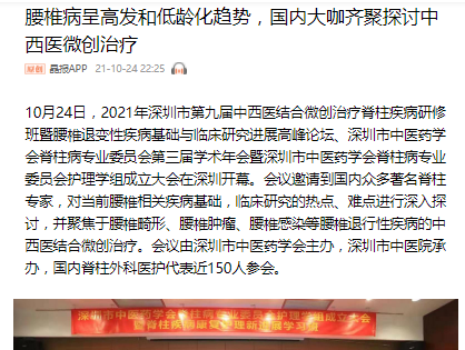 10月24日,2021年深圳市第九届中西医结合微创治疗脊柱疾病研修班暨腰椎退变性疾病基础与临床研究进展高峰论坛、深圳市中医药学会脊柱病专业委员会第三届学术年会暨深圳市中医药学会脊柱病专业委员会护理学组成立大会在深圳开幕。会议邀请到国内众多著名脊柱专家,对当前腰椎相关疾病基础,临床研究的热点、难点进行深入探讨,并聚焦于腰椎畸形、腰椎肿瘤、腰椎感染等腰椎退行性疾病的中西医结合微创治疗。会议由深圳市中医药学会主办,深圳市中医院承办,国内脊柱外科医护代表近150人参会。