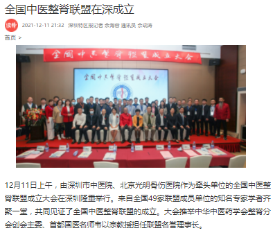 12月11日上午,由深圳市中医院、北京光明骨伤医院作为牵头单位的全国中医整脊联盟成立大会在深圳隆重举行。来自全国49家联盟成员单位的知名专家学者齐聚一堂,共同见证了全国中医整脊联盟的成立。大会推举中华中医药学会整脊分会创会主委、首都国医名师韦以宗教授担任联盟名誉理事长。