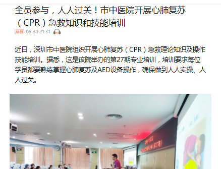 近日,深圳市中医院组织开展心肺复苏(CPR)急救理论知识及操作技能培训。据悉,这是该院举办的第27期专业培训,培训要求每位学员都要熟练掌握心肺复苏及AED设备操作,确保做到人人实操、人人过关。