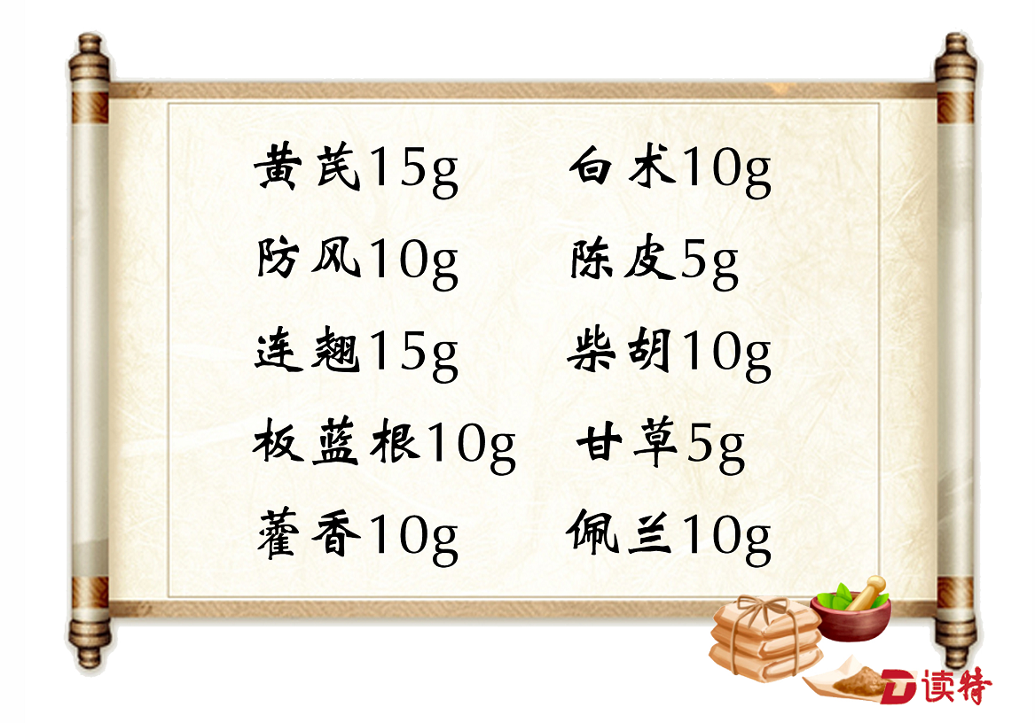 组成:黄芪15g、白术10g、防风10g、陈皮5g、连翘15g、柴胡10g、板蓝根10g、甘草5g、藿香10g、佩兰10g。