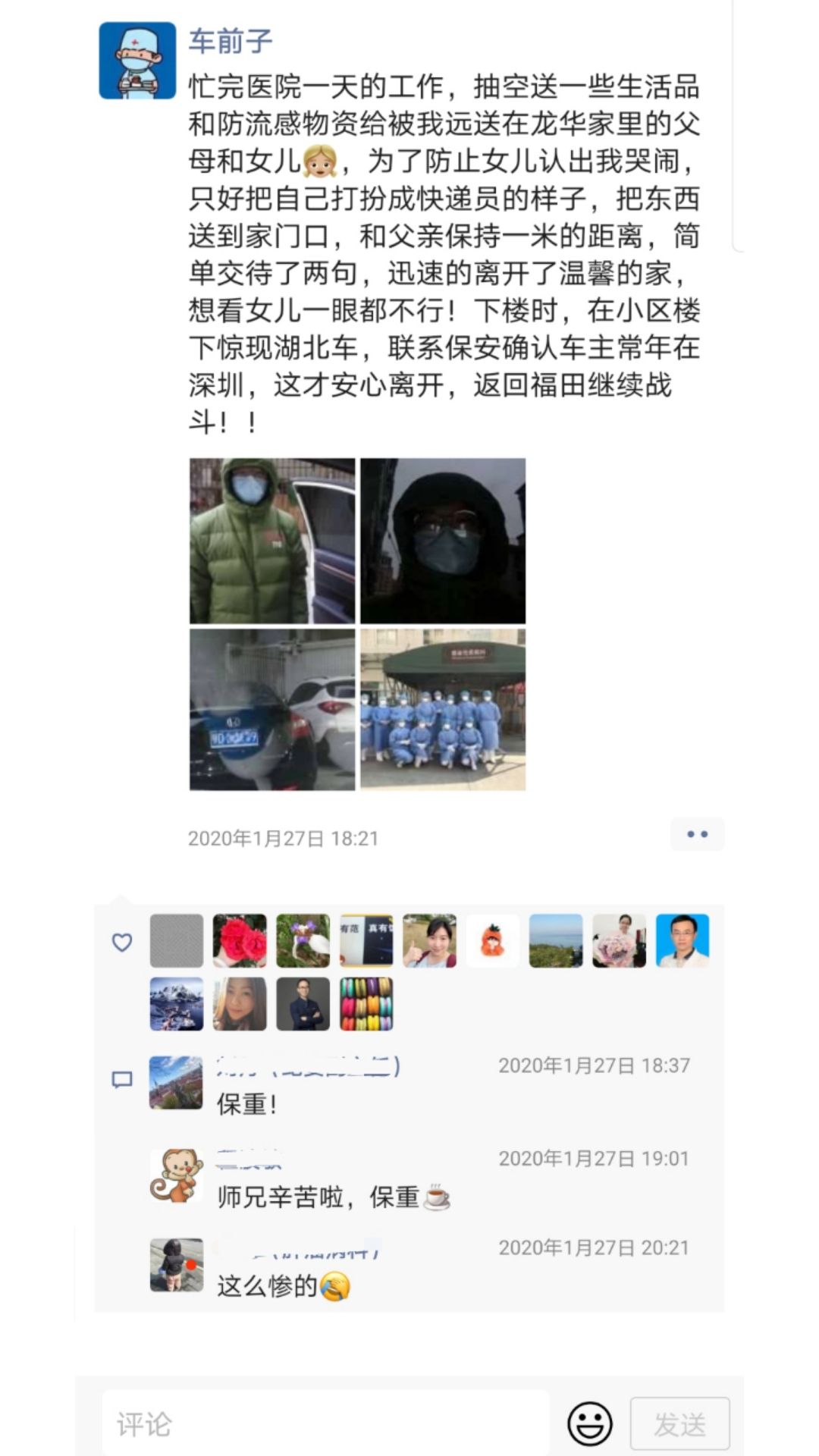 1月27日,在忙完工作后,车医生抽空给自己在龙华的父母和女儿送了一些生活用品和防流感物资。为了防止3岁的女儿认出自己,舍不得让自己离开而哭闹,他只好把自己打扮成“快递员”的样子,把东西放到家门口,和父亲保持一米的距离,简单交代了两句,就匆匆离开了。车医生表示,平时女儿跟他们夫妇住在一起,很黏自己。这次,转眼有一周没见女儿了。他坦言,主动与家人隔离是防患于未然。