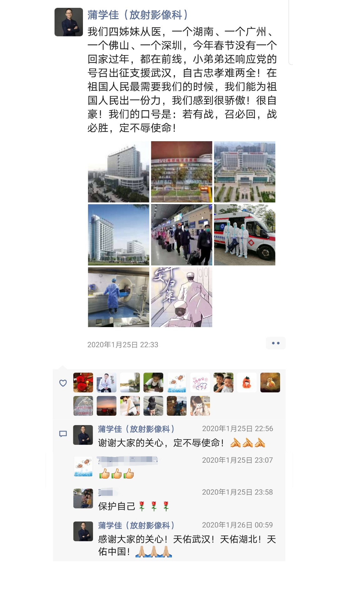 近日,市中医院医生蒲学佳朋友圈里的一条消息引起大家关注:“自古忠孝难两全!在祖国人民最需要我们的时候,我们能为祖国人民出一份力,我们感到很骄傲!很自豪!”