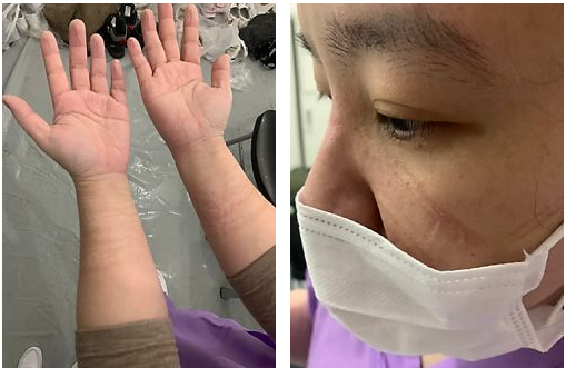 到了下班时间,我们开始出舱,需要在不同的房间里脱去不同的东西。一个缓冲间也只能同时开启一个门。在第一道缓冲间,我们需要脱去外层鞋套;进入第二缓冲间,有脱班的老师协助我们脱去护目镜、防护服、防水靴套、外层手套;进第三缓冲间,脱去我们的隔离衣、内层鞋套、内层手套、一次性帽子、N95口罩,并更换为外科口罩。脱下靴套时,我清晰地看到自己裤子小腿的位置全湿透了。脱下手套和口罩,可以看到手已经泡白且有明显压痕,鼻梁和颧骨的皮肤也有红红的压痕。