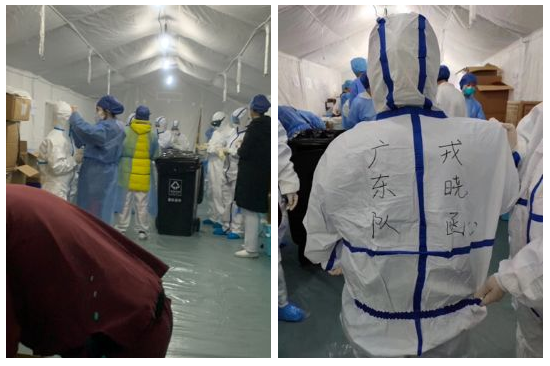 由于我们是第一次进舱,大家穿防护服所用的时间较长,原先已经在这里开展工作的老师就先入舱接班了。作为党员,我被委任为小组的临时党委委员,负责按照上级的指示在病区开展各项工作。今天,我需要清点我们广东队的人员,待全员穿戴好后共同进入舱内。由于需要喊话,还未入舱,护目镜就已经全起雾了。幸好还在准备间,外围班的管护长马上帮我又涂了一层碘伏,瞬间世界又清晰了。
