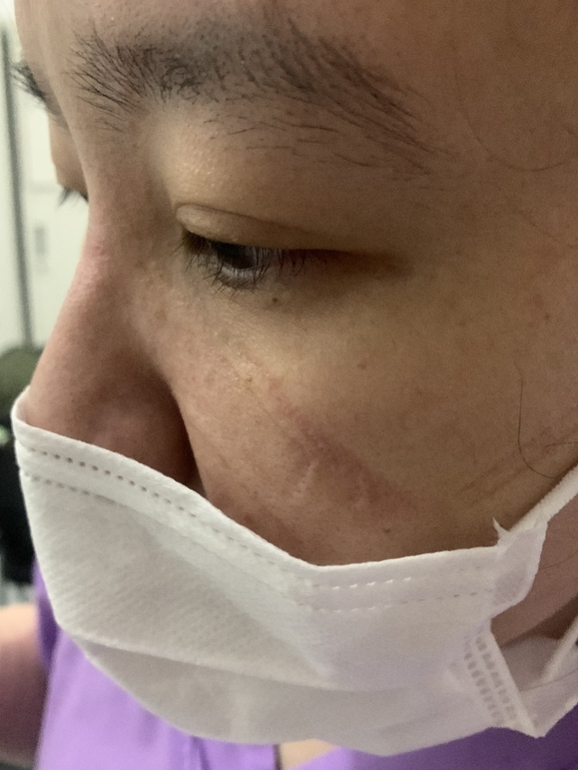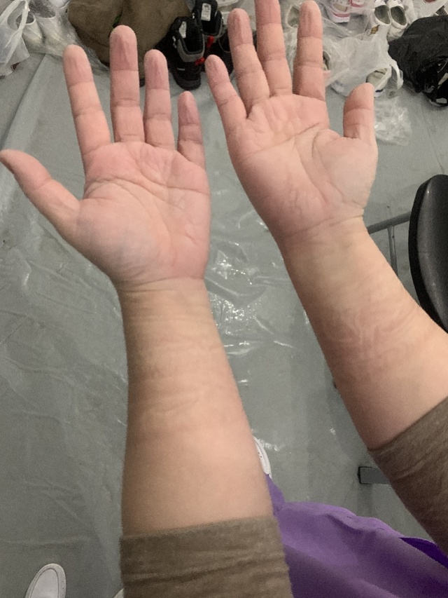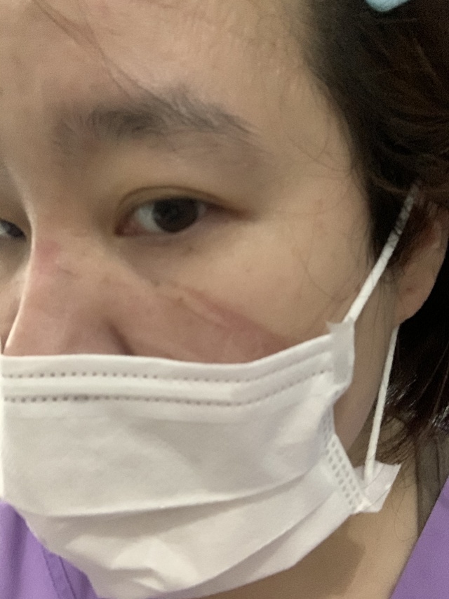到了下班时间,我们开始出舱,需要在不同的房间里脱去不同的东西。一个缓冲间也只能同时开启一个门。在第一道缓冲间,我们需要脱去外层鞋套;进入第二缓冲间,有脱班的老师协助我们脱去护目镜、防护服、防水靴套、外层手套;进第三缓冲间,脱去我们的隔离衣、内层鞋套、内层手套、一次性帽子、N95口罩,并更换为外科口罩。脱下靴套时,我清晰地看到自己裤子小腿的位置全湿透了。脱下手套和口罩,可以看到手已经泡白且有明显压痕,鼻梁和颧骨的皮肤也有红红的压痕。