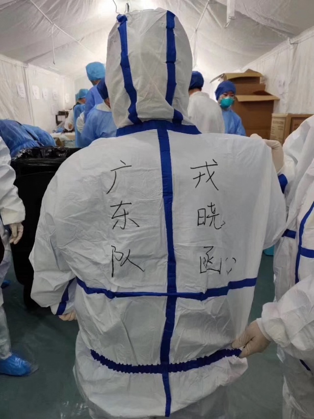 由于我们是第一次进舱,大家穿防护服所用的时间较长,原先已经在这里开展工作的老师就先入舱接班了。作为党员,我被委任为小组的临时党委委员,负责按照上级的指示在病区开展各项工作。今天,我需要清点我们广东队的人员,待全员穿戴好后共同进入舱内。由于需要喊话,还未入舱,护目镜就已经全起雾了。幸好还在准备间,外围班的管护长马上帮我又涂了一层碘伏,瞬间世界又清晰了。