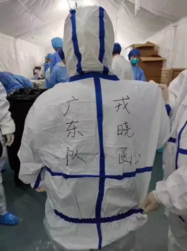 帐篷中已贴好明显的标识,我们跟着标识的顺序一步一步地做:入门测体温、登记姓名、领取珍贵的N95口罩、戴一次性帽子、穿鞋套、穿隔离衣、戴内侧手套,然后选择适合自己的防护服,调整好防护服,写上自己的队名、个人姓名及自己所管的区域,之后还要为我们的护目镜涂上一层碘伏,防止起雾,最后就是套上我们的防水鞋套。一切穿戴好之后,外围班的老师开始帮我们一一检查,为大家的安全做保障。