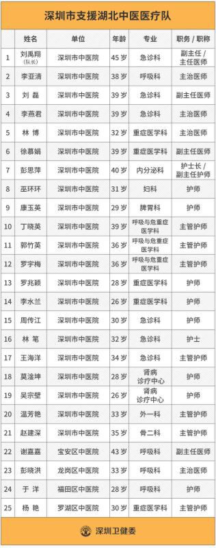 25人中,医生8名,包括主任医师1人,副主任医师3人,主治医师4名;护士17名,包括副主任护师1名,主管护师7名,护师9名。在人员组成上,21人来自深圳市中医院,4人来自各区中医院,男性12人,女性13人,年龄最大为45岁,最小为26岁,涵盖中医内科、中西结合和护理学等专业。