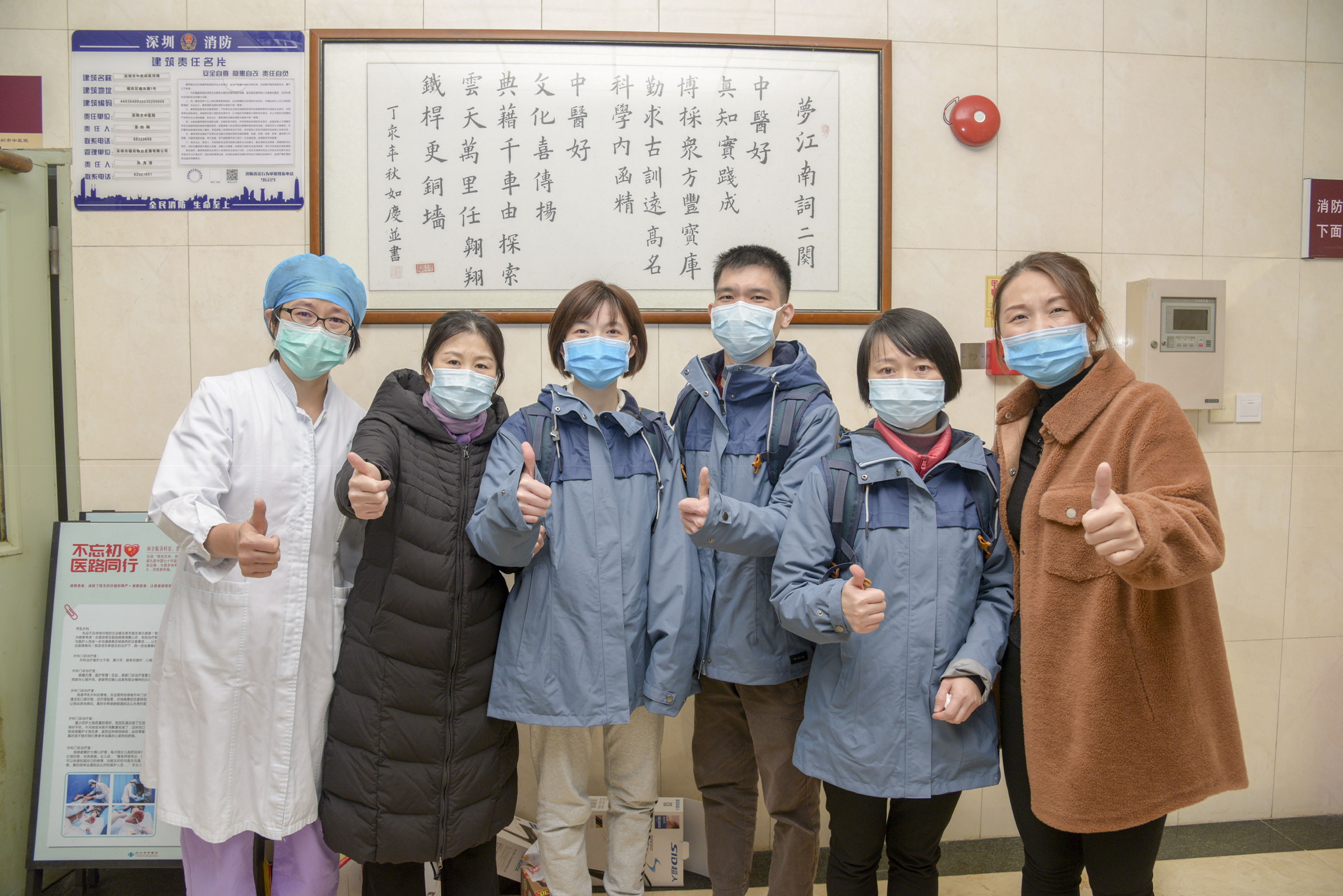 2月17日,深圳援助湖北中医医疗队队员李水兰(左三)、罗兆颖(右三)、彭思萍(右二)在出发前与同事合影。