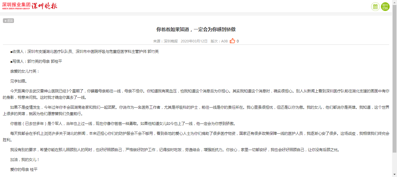 如果不是疫情发生,今年过年你本会回湖南老家和我们一起团聚。你说作为一名医务工作者,尤其是呼吸科的护士,前往一线是你的责任所在。我心里虽很担忧,但还是以你为傲。我的女儿,他们都说你是英雄。我知道,这个世界上很多的英雄,就因为他们愿意替我们负重前行。
