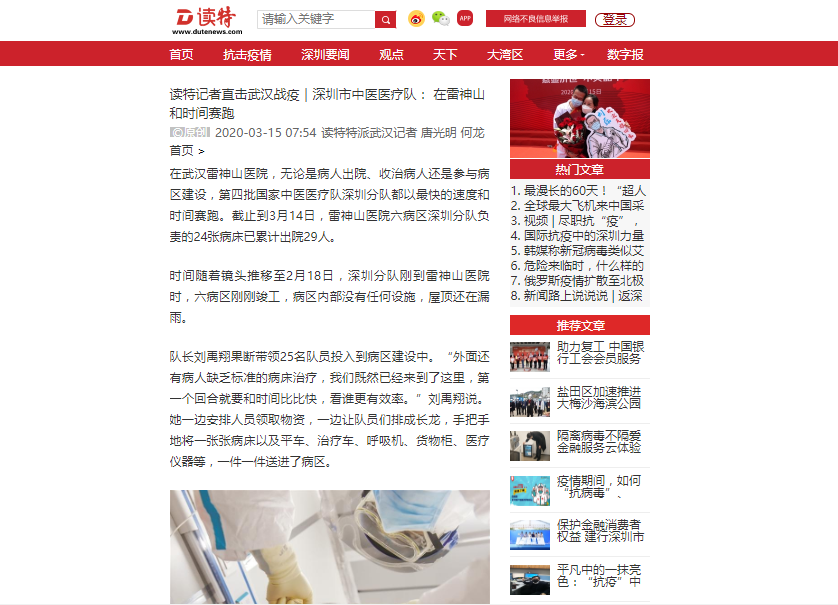 “仅仅10天,六病区第一批病人康复出院。”国家医疗队中医专家组副组长张忠德介绍,从此“深圳速度”开始在雷神山医院传开。