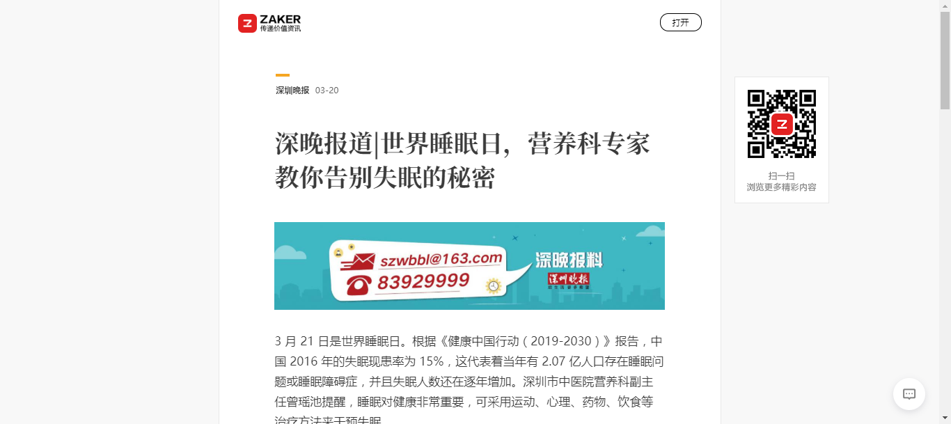 3 月 21 日是世界睡眠日。根据《健康中国行动(2019-2030)》报告,中国 2016 年的失眠现患率为 15%,这代表着当年有 2.07 亿人口存在睡眠问题或睡眠障碍症,并且失眠人数还在逐年增加。深圳市中医院营养科副主任曾瑶池提醒,睡眠对健康非常重要,可采用运动、心理、药物、饮食等治疗方法来干预失眠。