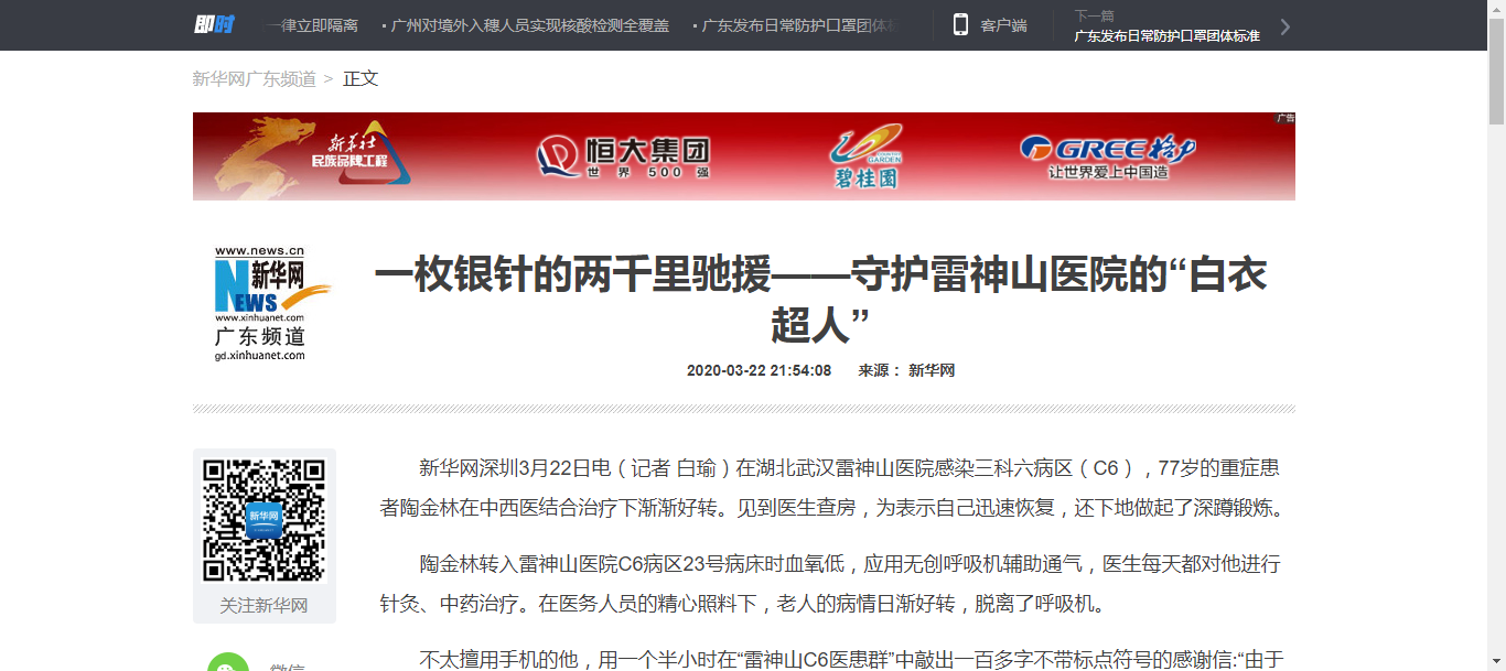 新华网深圳3月22日电(记者 白瑜)在湖北武汉雷神山医院感染三科六病区(C6),77岁的重症患者陶金林在中西医结合治疗下渐渐好转。见到医生查房,为表示自己迅速恢复,还下地做起了深蹲锻炼。