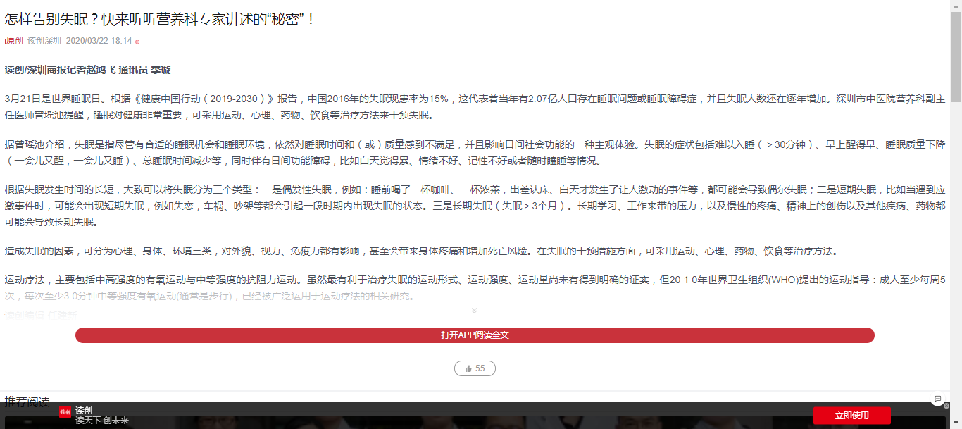 3月21日是世界睡眠日。根据《健康中国行动(2019-2030)》报告,中国2016年的失眠现患率为15%,这代表着当年有2.07亿人口存在睡眠问题或睡眠障碍症,并且失眠人数还在逐年增加。深圳市中医院营养科副主任医师曾瑶池提醒,睡眠对健康非常重要,可采用运动、心理、药物、饮食等治疗方法来干预失眠。