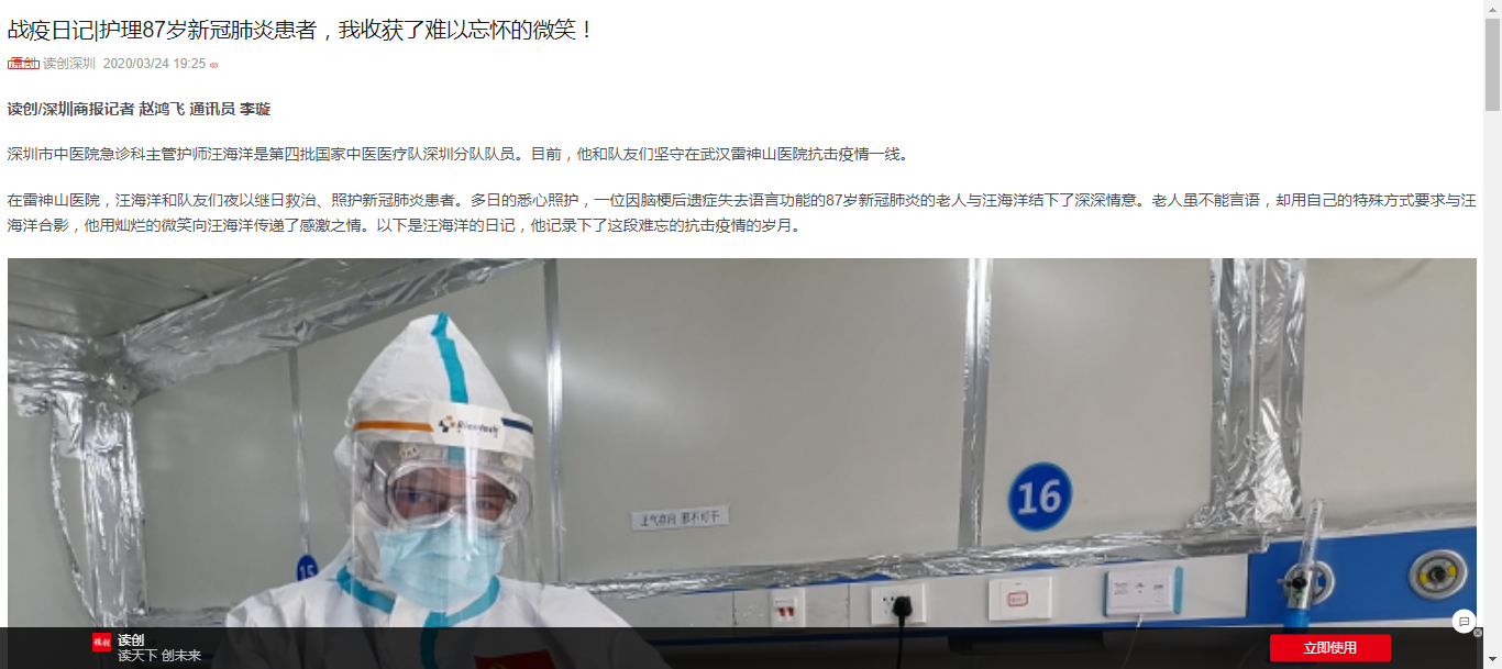 深圳市中医院急诊科主管护师汪海洋是第四批国家中医医疗队深圳分队队员。目前,他和队友们坚守在武汉雷神山医院抗击疫情一线。