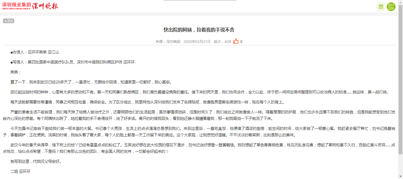 ■写信人:第四批国家中医医疗队队员、深圳市中医院妇科病区护师 巫环环