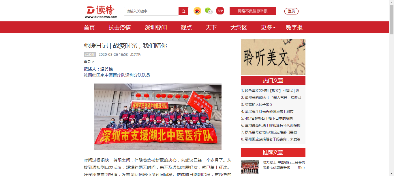 疫情暴发之时,我们的心是揪着的,担心越来越多的同胞被迫卷入病毒之战。就在此时,党中央迅猛出击,一系列的政策、措施之下,疫情正在慢慢得到控制。武汉是疫情重灾区,我们感谢深圳市政府、卫健委、院领导把我们派到这里,让我们有机会在疫情一线战斗。这一个月以来,我们流过汗、流过泪,感受着疫情之下的心声,感受着疫区同胞的期望。来到武汉,我们所行不过是本职工作,却将成为我毕生难忘的经历。