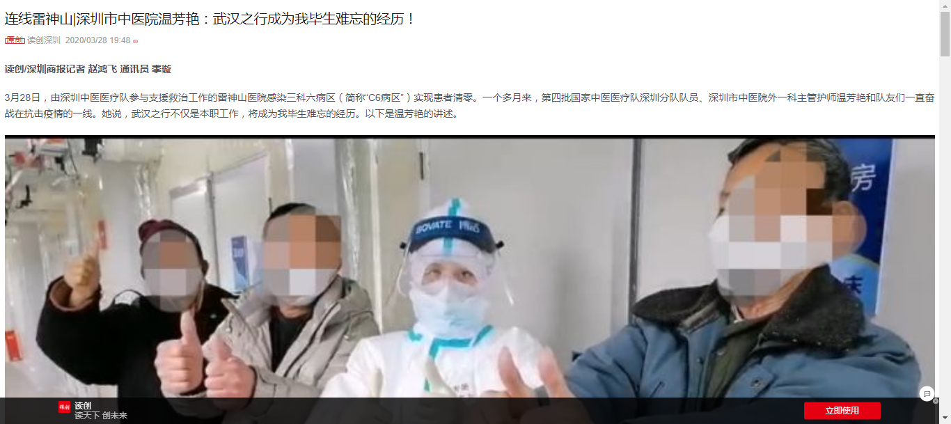 3月28日,由深圳中医医疗队参与支援救治工作的雷神山医院感染三科六病区(简称“C6病区”)实现患者清零。一个多月来,第四批国家中医医疗队深圳分队队员、深圳市中医院外一科主管护师温芳艳和队友们一直奋战在抗击疫情的一线。她说,武汉之行不仅是本职工作,将成为我毕生难忘的经历。以下是温芳艳的讲述。