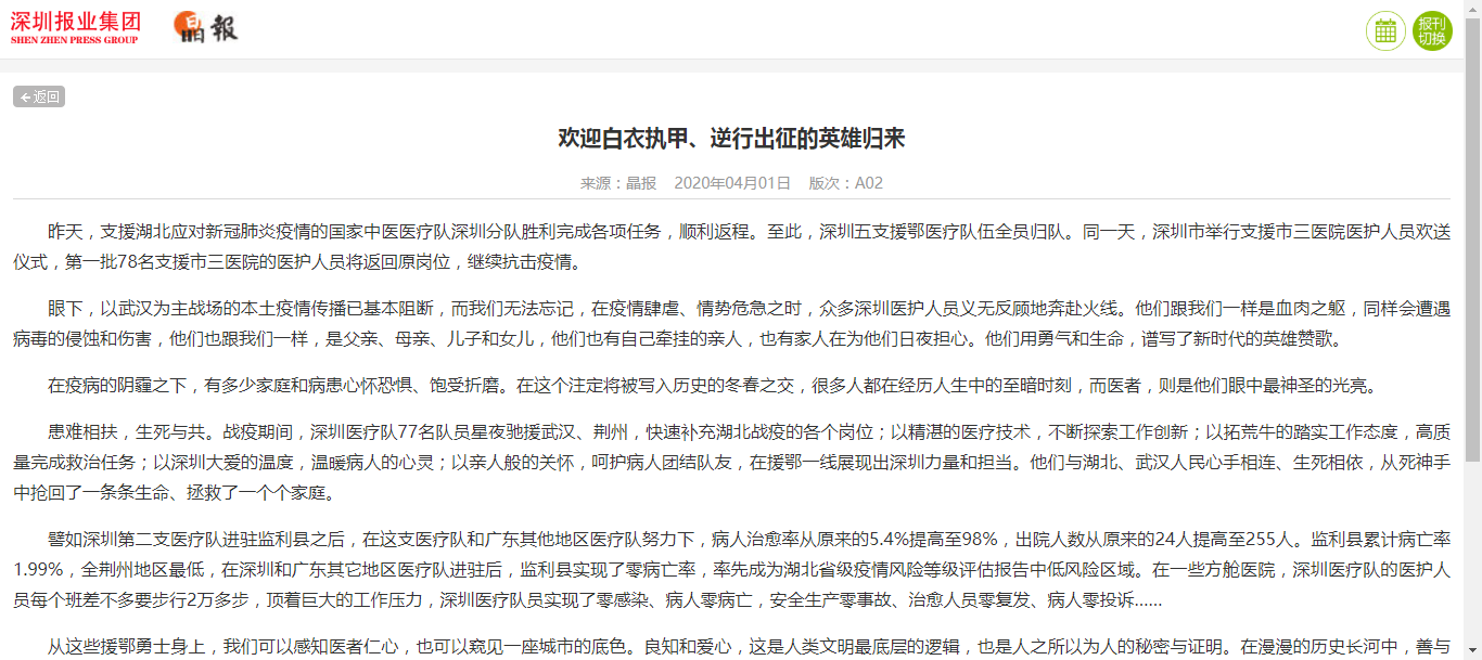 【晶报】欢迎白衣执甲、逆行出征的英雄归来