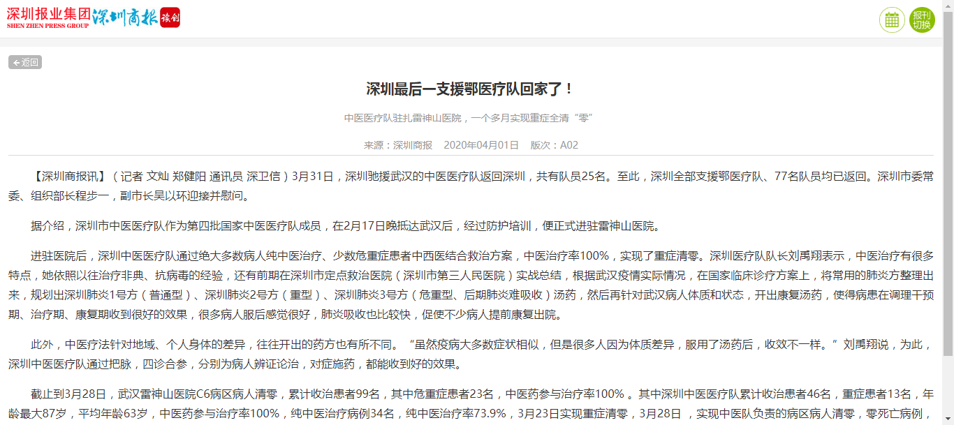 【深圳商报】深圳最后一支援鄂医疗队回家了! 中医医疗队驻扎雷神山医院,一个多月实现重症全清“零”