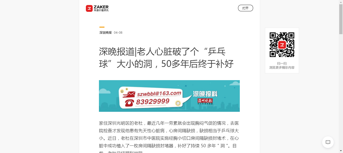 家住深圳光明区的老杜,最近几年一劳累就会出现胸闷气促的情况,去医院检查才发现他患有先天性心脏病,心房间隔缺损,缺损相当于乒乓球大小。近日,老杜在深圳市中医院实施经胸小切口房间隔缺损封堵术,在心脏中成功植入了一枚房间隔缺损封堵器,补好了持续 50 多年 " 洞 "。目前,老杜已经顺利出院。