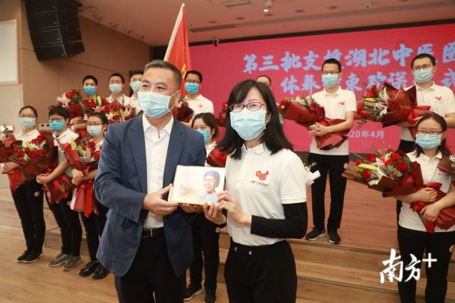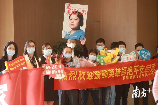 25名队员中,有21名来自深圳市中医院。医院为驰援湖北以及深圳市第三人民医院的医护人员,共同举办了一场简单的欢迎仪式。“最美逆行者”的海报铺满现场,队员们忙着与家属以及科室的小伙伴们合影,用镜头记录下这一刻的感动。