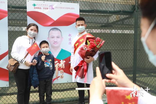 今天,李振南穿着一身帅气的西装,一手抱着鲜花,一手举着“洋仔,一起去吃烤鱼啊”的牌子,见到了日思夜想的她。李振南也是广州中医药大学深圳医院的医护人员,两人原本打算在这个春节举行婚礼。后来于洋去支援雷神山医院,婚礼也就推迟了。