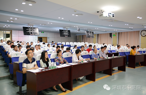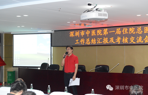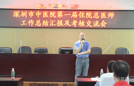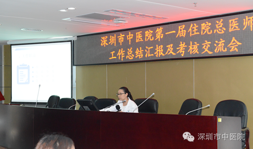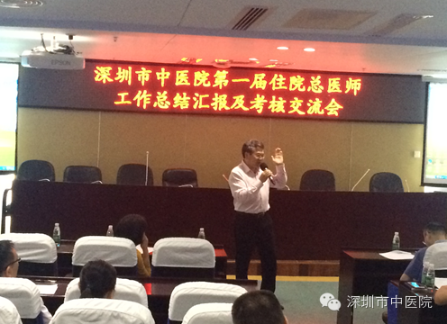 接下来,贺劲松科长介绍了本次交流会会议流程及住院总医师结业考核评价指标及评分细则等;随后,我院任职期满的20位第一届住院总医师依次就自己一年来的工作、学习和生活等情况向莅临交流会现场的院领导、学术委员会专家等做了详细汇报;现场考评专家根据《深圳市中医院住院总工作考核评分表》对各位住院总医师依次进行了考核评分及点评指导。