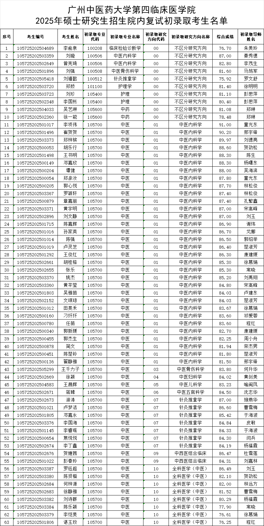 广州中医药大学第四临床医学院2025年硕士研究生招生院内复试初录取考生名单