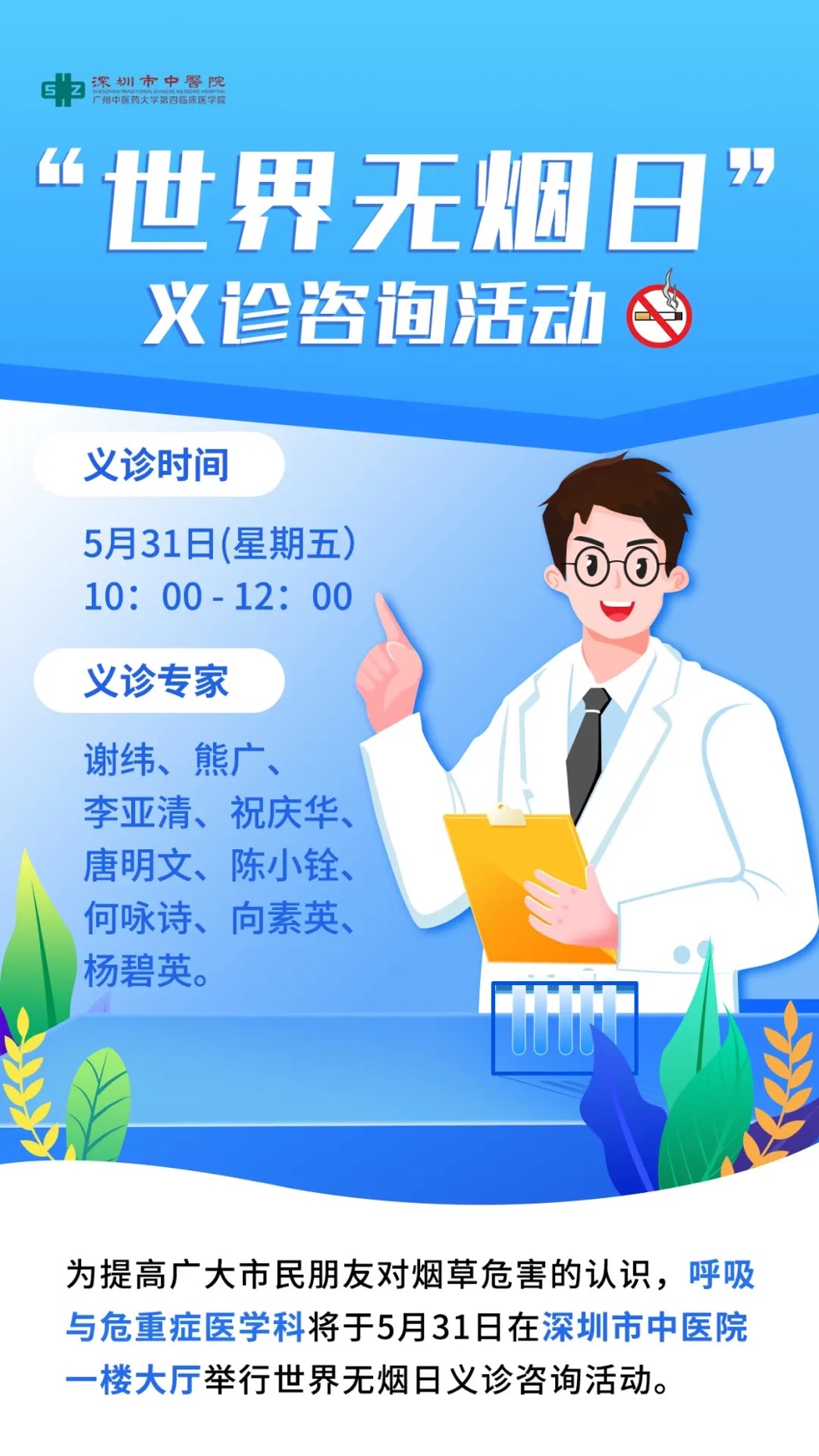 2024年5月31日是“世界无烟日”。为提高广大市民朋友对烟草危害的认识,呼吸与危重症医学科将于2024年5月31日在深圳市中医院一楼大厅举行世界无烟日义诊咨询活动。