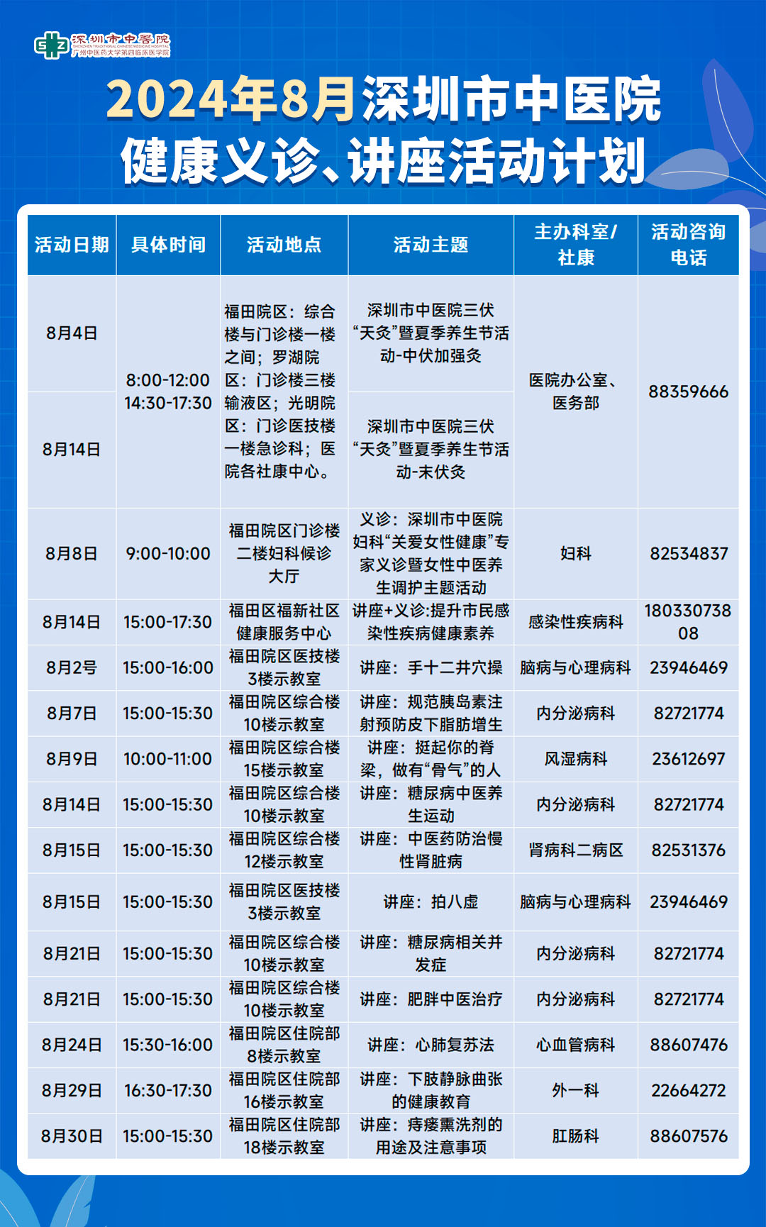 为进一步加大健康知识普及力度,提高全民健康素养,构建健康科普新风尚,助力全面推进健康中国建设,深圳市中医院发扬中医药特色优势,每月均开展系列健康教育活动。