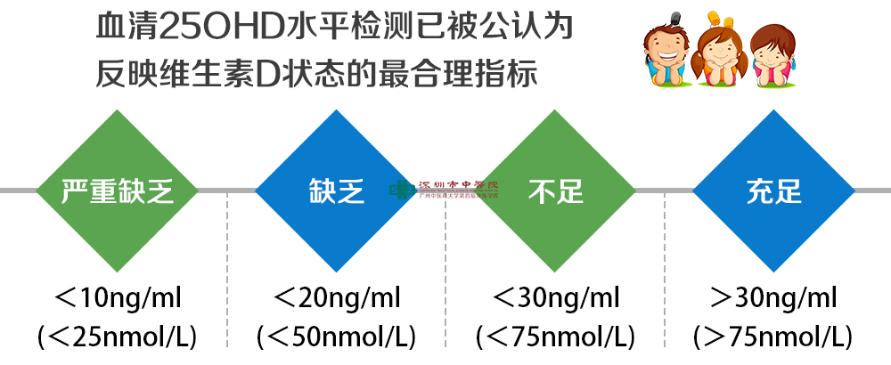 维生素D属于类固醇激素,主要包括维生素D2与D3,皮肤是维生素D合成的主要组织,阳光和紫外线可将皮下储存的7-脱氢胆固醇转化为维生素D3,这是人体维生素D的主要来源。少量维生素D可从食物摄入获得。 目前国际、国内多数机构和专家认为:血清25OHD<10ng/ml(<25nmol/L)为严重缺乏,<20ng/ml(50nmol/L)为维生素D缺乏,20~30ng/ml(50~75nmol/L)为维生素D不足,>30ng/ml(>75nmol/L)为维生素D充足。按照该标准,全球维生素D不足或缺乏相当普遍,约占总人口的50%~80%。中国人群也普遍存在维生素D不足或缺乏。我国5个不同纬度的大城市(北京、武汉、广州、上海、重庆)的大样本、横断面调查显示:血清25OHD的平均水平为(19.87±8.14)ng/ml,其中 血清25OHD充足、不足、缺乏的、比例分别为11.7%、31.3%和57.0%。