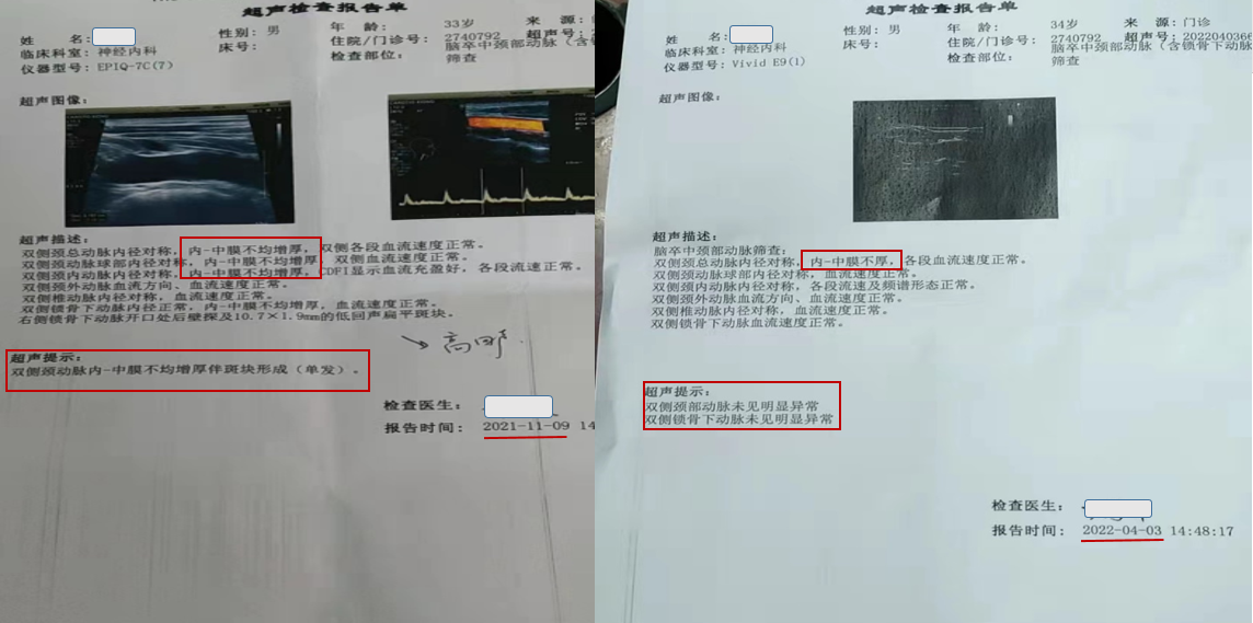 经过大约3个月的营养治疗,也是收获了很圆满的效果,患者去第一次检查发现颈动脉斑块的医院再次复查,结果提示:双侧颈部动脉未见明显异常。结果对比详见下图。