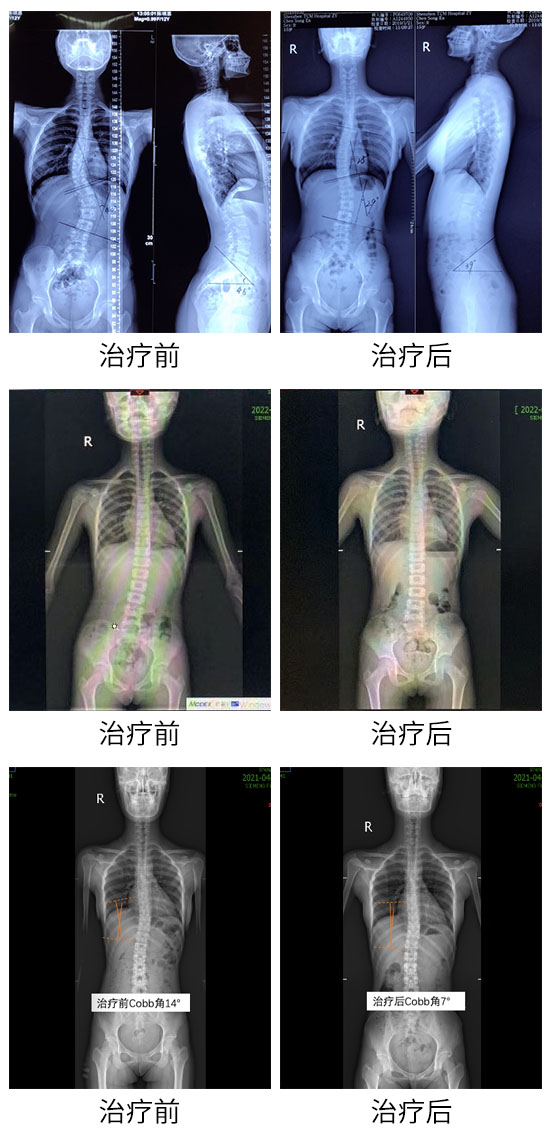 1. 中医整脊医学通过“理筋、正骨调曲、练功“等整体治疗青少年脊柱侧弯症。根据大样本临床统计,在经过2周左右的集中治疗后,可帮助脊柱侧弯度数的改善,与手术效果基本相当,但是其无需开刀、痛苦少、风险小,是目前国内领先的青少年脊柱侧弯症非手术疗法。